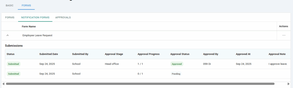 The Employee can then view all submissions they’ve made by expanding the arrow underneath the form and can even check if the form was approved, if it has an approvals process.