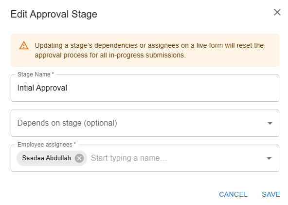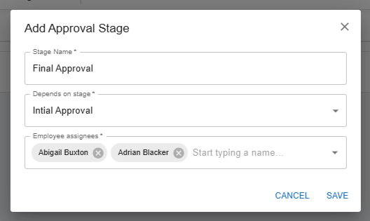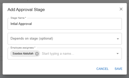 After naming the stage, there is a selection box as to whether the stage depends on another one. If it is the first stage, there will be none to select from and you can add the assignee/s for approval.