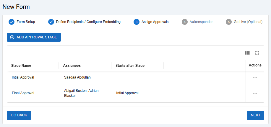 Once the stages are created they are saved and you can navigate to the next step of the form creation workflow or click Actions to edit or delete them.