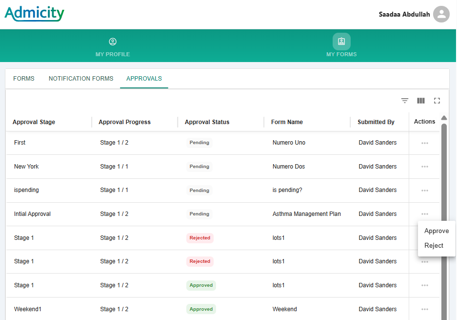 Stages can be assigned to one or more active employees, and only once a form response is submitted it will show up in the Approvals tab of the My Forms table for the employee. Pending approvals will display at the top of the table ordered by the oldest submitted form response first. Only the stage that the employee is assigned to can be viewed and they can click under the Actions column to Approve or Reject the form.