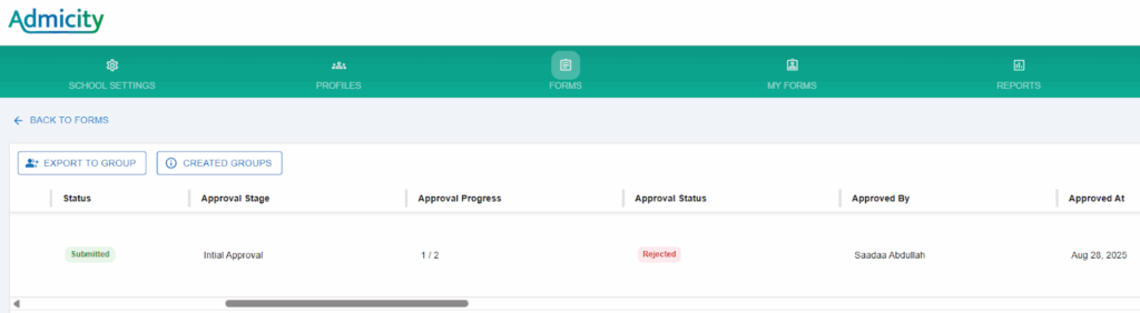The approval process can be tracked in the form responses page and will show up in the approval columns of the form where the school can see the Approval Stage name, Approval Progress which will display what stage it is out of currently, Approval Status of the current stage and who approved/rejected the form at that stage.