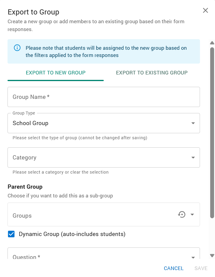 Note: If a new student is manually added to the group assigned to the form, a new form request will be automatically generated. However, this does not happen immediately—it may take up to one hour for the form request to be triggered. If Dynamic is selected, any new responses to the form that are submitted after the group is created will be added to the group if they meet the criteria.
