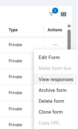 To view form submissions/responses, go to the Forms tab and select View responses in the form Actions.