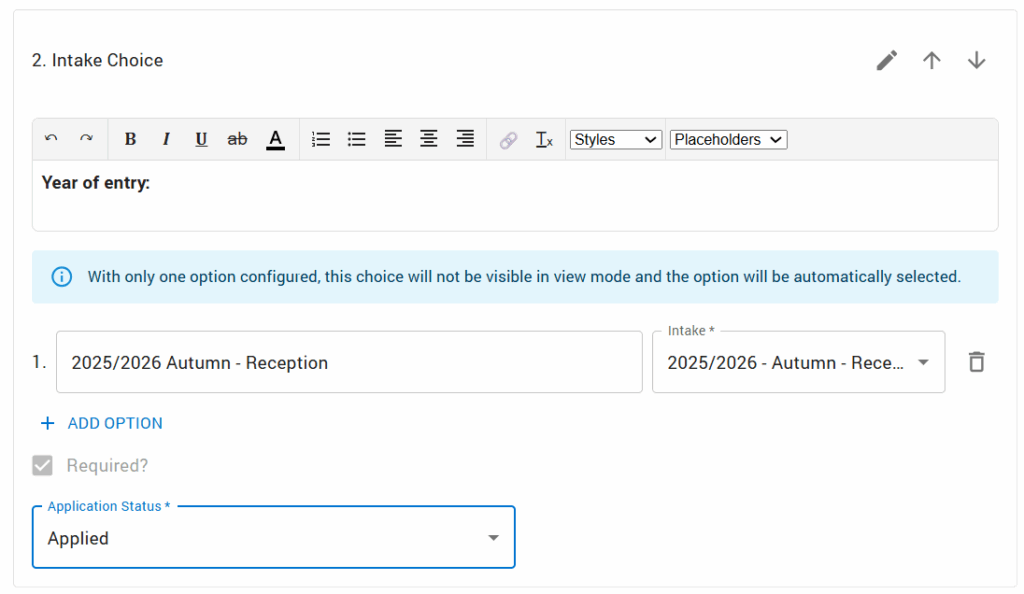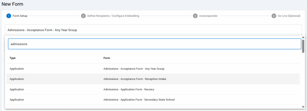 Each customer school can create their own unique Application Form, customised by Admicity to match their particular student intake and admissions criteria. These forms have a form Type of ‘Application’ when searching in the form builder: