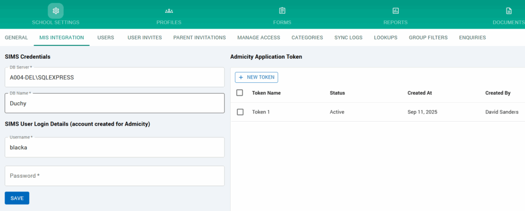 Once set up, it is advised you do not change these credentials unless a SIMS server change is being made where they are likely to need updating. Please contact support@admicity.co.uk if you accidently change these settings and are not sure how to fix this.