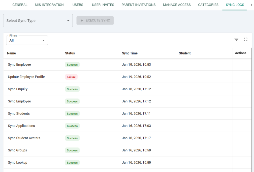 Syncs of data are set automatically in the General tab of the School Settings page. Bespoke manual syncs can be made by the school admin by selecting a sync type option at the top of the Sync Logs page.